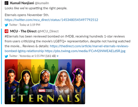 It appears that some people are offended by this and have taken it upon themselves to review bomb the picture. IMDbs rating for Eternals was overwhelmed with nasty reviews with over 400 1-star reviews. It appears a subset of people have taken issue with this and brought it upon themselves to review bomb the film.